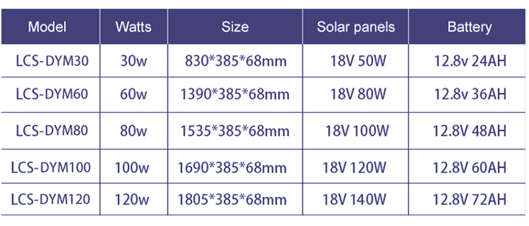 Specifications Of LECUSO DYM Series LED Solar Street Light | |||||